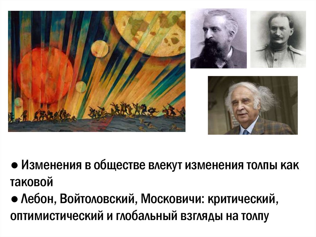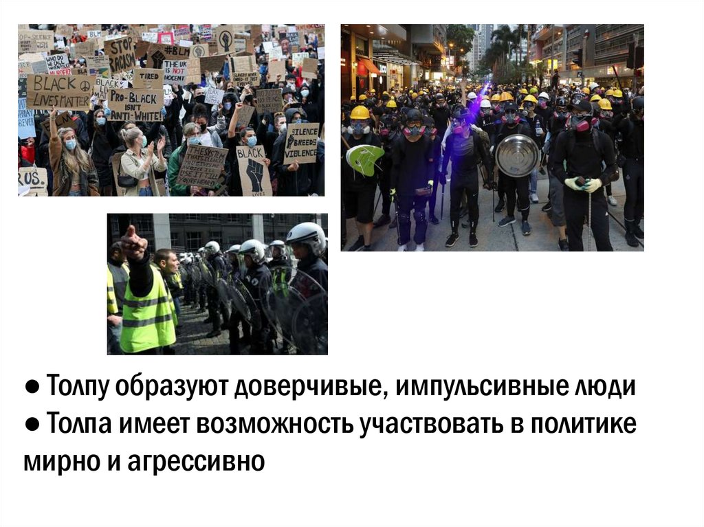 ● Толпу образуют доверчивые, импульсивные люди● Толпа имеет возможность участвовать в политике