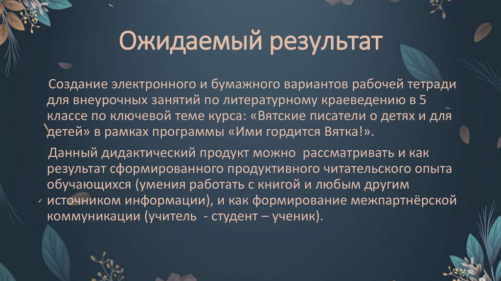 Ожидаемый результатСоздание электронного и бумажного вариантов рабочей тетради
