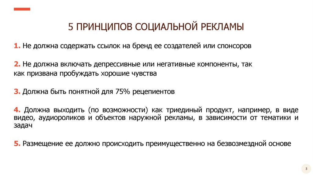5 ПРИНЦИПОВ СОЦИАЛЬНОЙ РЕКЛАМЫ1. Не должна содержать ссылок на бренд ее создателей или спонсоров