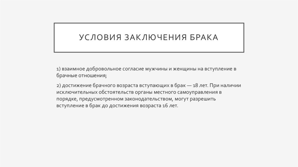 УСЛОВИЯ ЗАКЛЮЧЕНИЯ БРАКА1) взаимное добровольное согласие мужчины и женщины на вступление в
