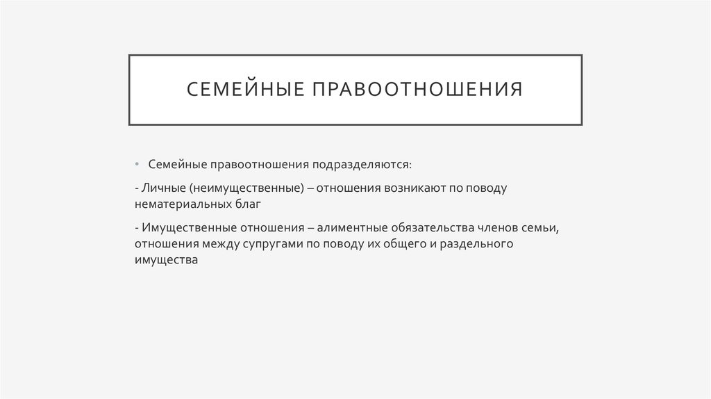 - Имущественные отношения – алиментные обязательства членов семьи,