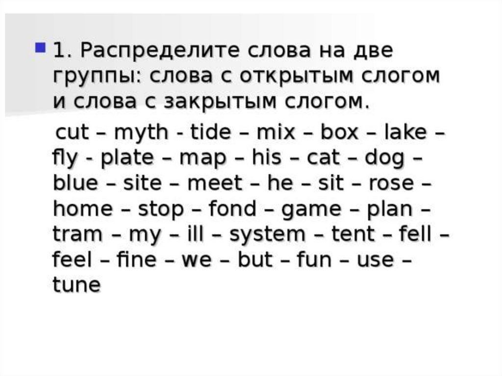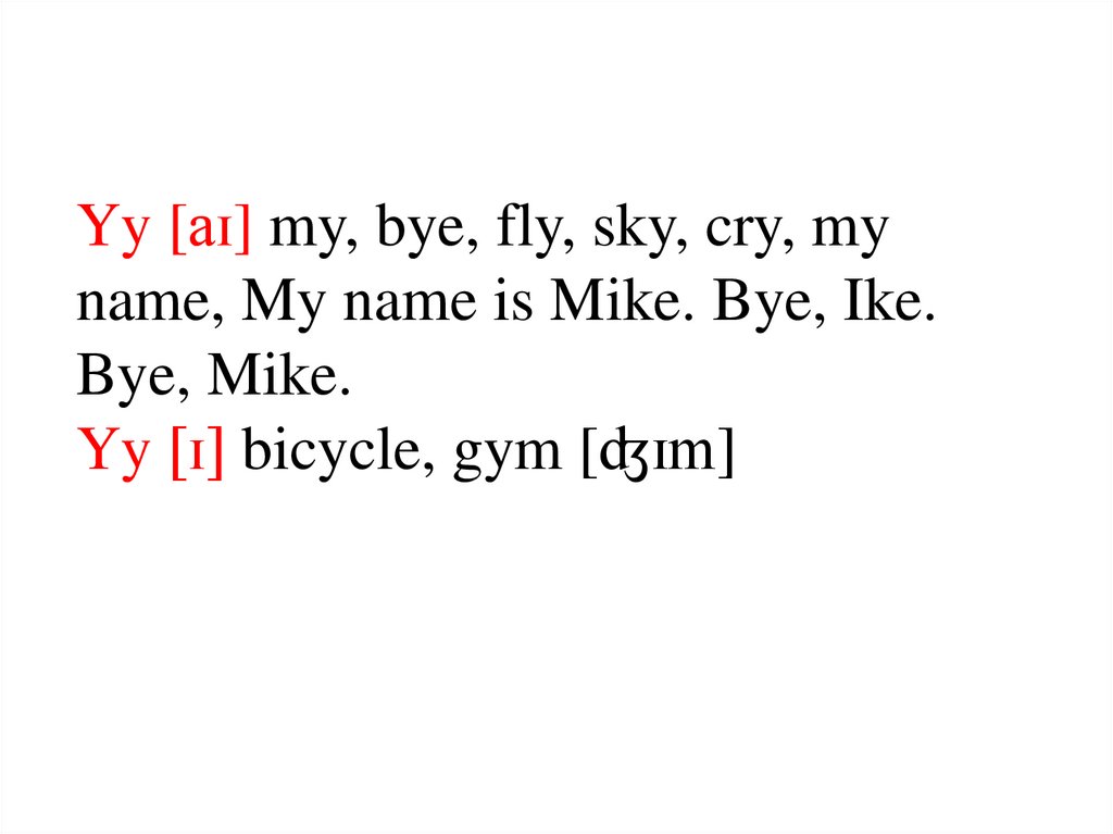 Yy [aɪ] my, bye, fly, sky, cry, myname, My name is Mike. Bye, Ike.