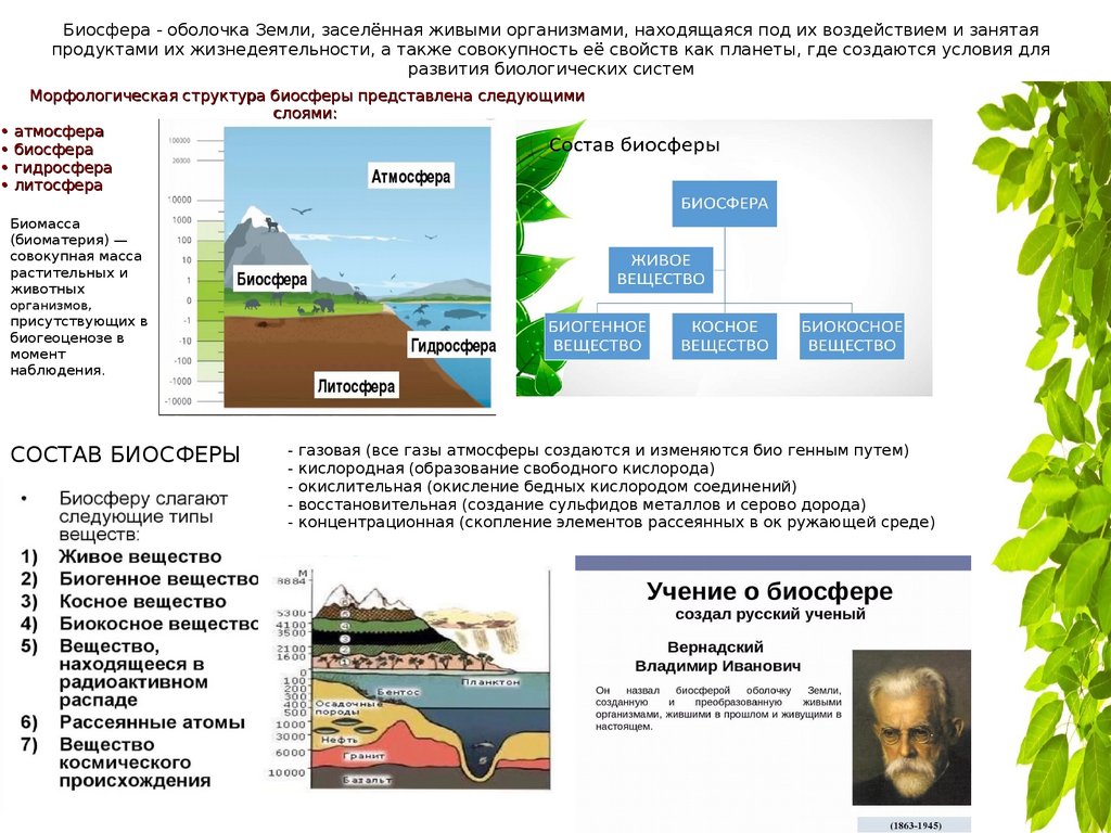 Биосфера - оболочка Земли, заселённая живыми организмами, находящаяся под их воздействием и занятаяпродуктами их жизнедеятельности, а также совокупность её свойств как планеты, где создаются условия для