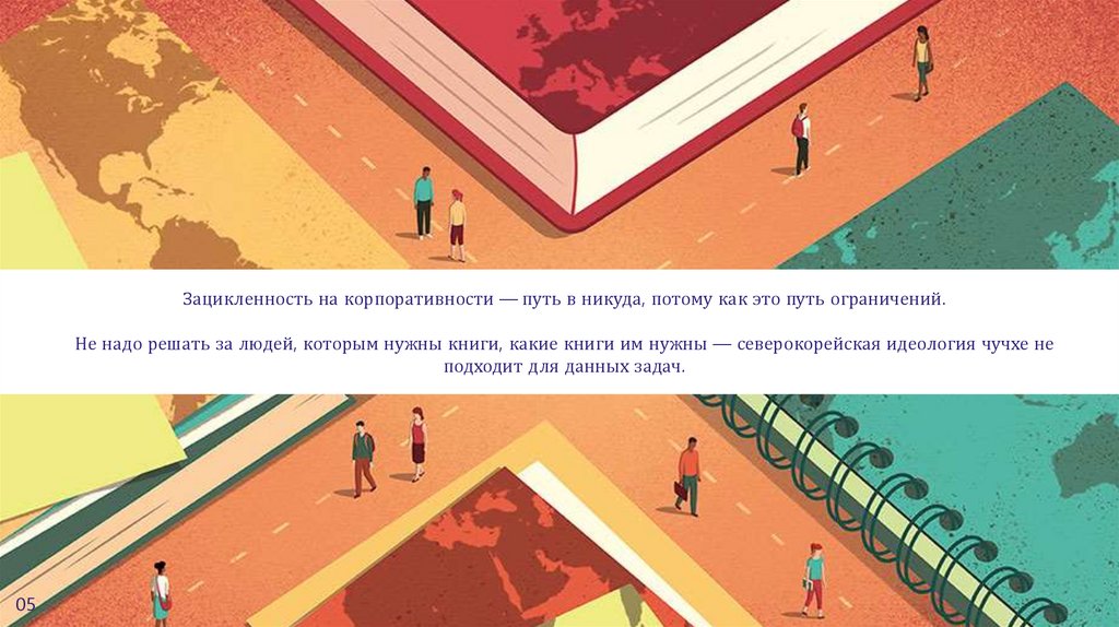 Зацикленность на корпоративности — путь в никуда, потому как это путь ограничений.Не надо решать за людей, которым нужны книги, какие книги им нужны — северокорейская идеология чучхе не