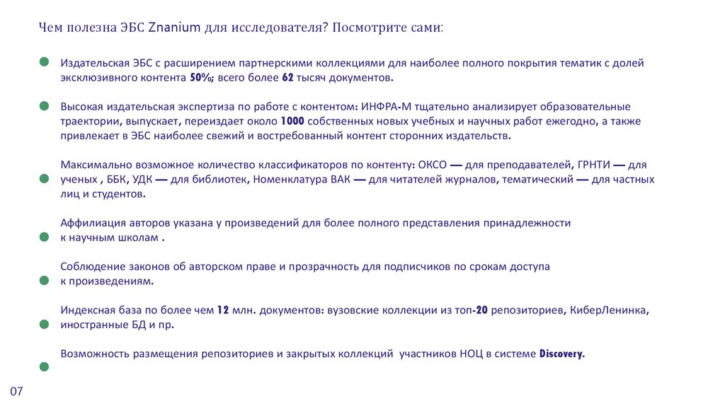 Чем полезна ЭБС Znanium для исследователя? Посмотрите сами:Издательская ЭБС с расширением партнерскими коллекциями для наиболее полного покрытия тематик с долей