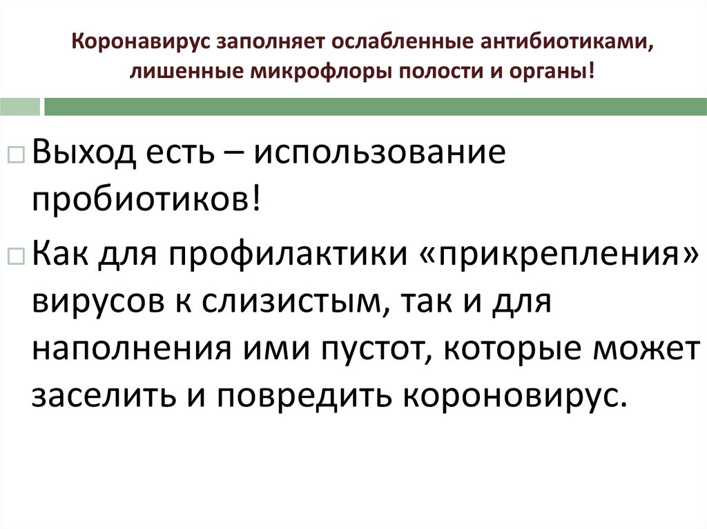 Коронавирус заполняет ослабленные антибиотиками,лишенные микрофлоры полости и органы!
