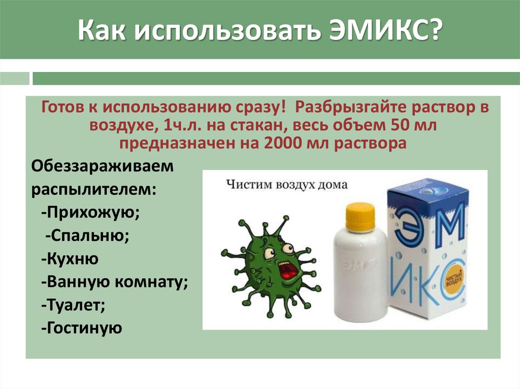 Как использовать ЭМИКС?Готов к использованию сразу! Разбрызгайте раствор в