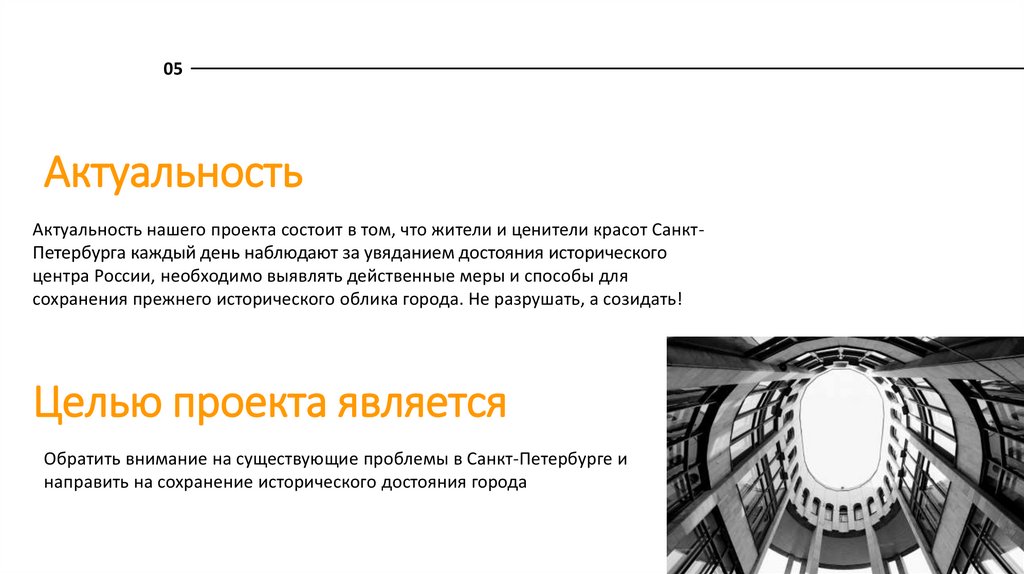 Актуальность нашего проекта состоит в том, что жители и ценители красот СанктПетербурга каждый день наблюдают за увяданием достояния исторического