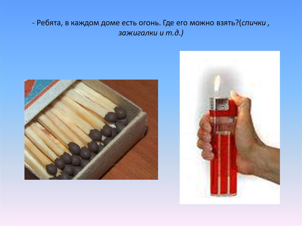 - Ребята, в каждом доме есть огонь. Где его можно взять?(спички ,зажигалки и т.д.)