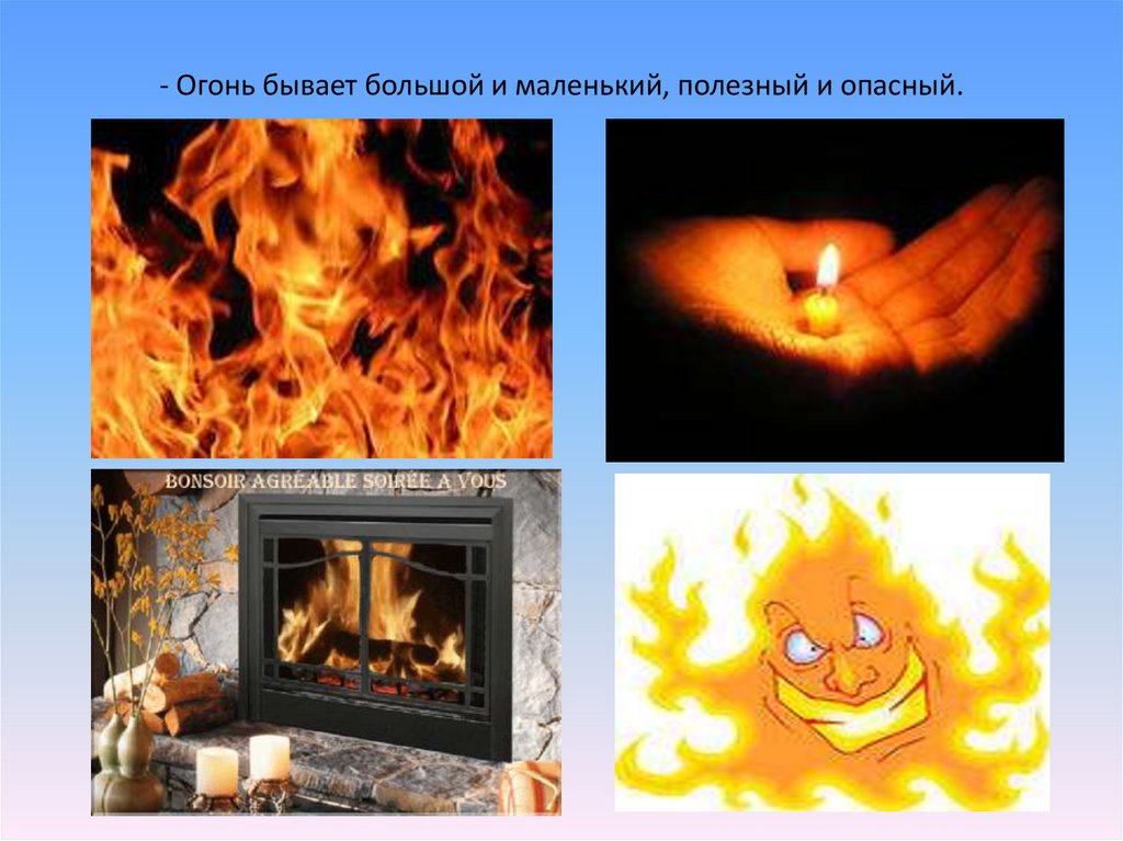 - Огонь бывает большой и маленький, полезный и опасный.4.