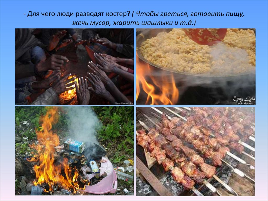 - Для чего люди разводят костер? ( Чтобы греться, готовить пищу,жечь мусор, жарить шашлыки и т.д.)