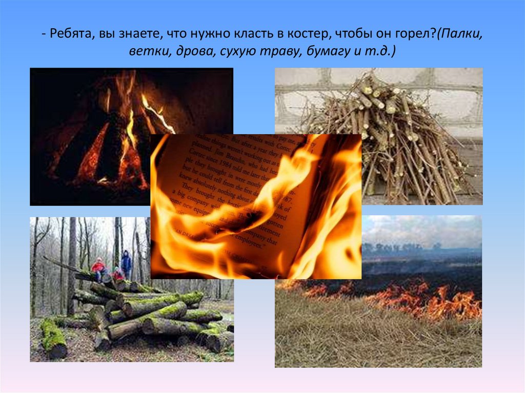 - Ребята, вы знаете, что нужно класть в костер, чтобы он горел?(Палки,ветки, дрова, сухую траву, бумагу и т.д.)