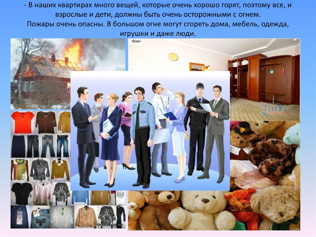 - В наших квартирах много вещей, которые очень хорошо горят, поэтому все, ивзрослые и дети, должны быть очень осторожными с огнем.