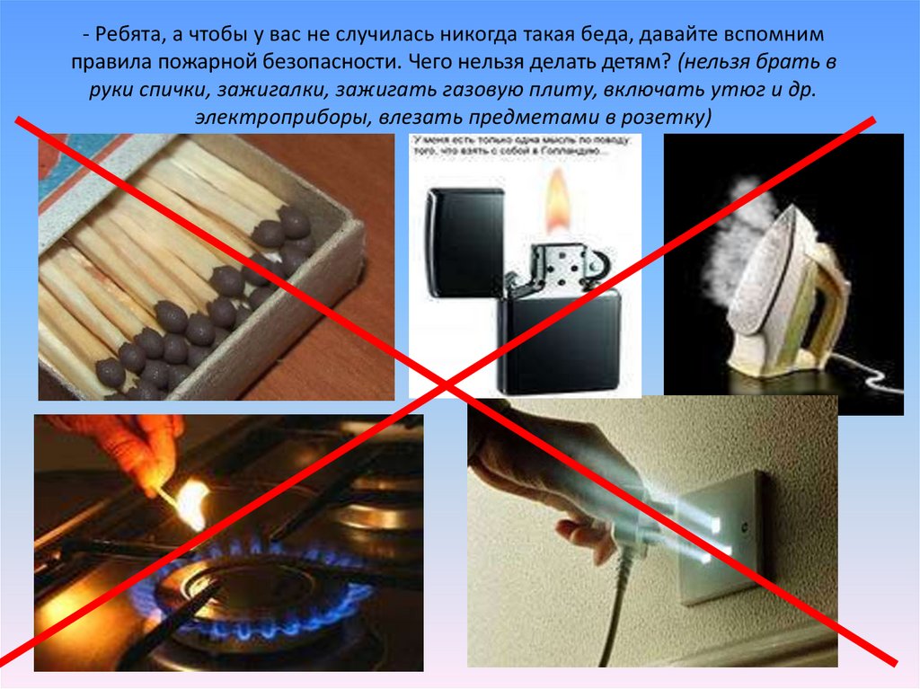 - Ребята, а чтобы у вас не случилась никогда такая беда, давайте вспомнимправила пожарной безопасности. Чего нельзя делать детям? (нельзя брать в