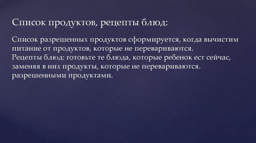 Список продуктов, рецепты блюд:Список разрешенных продуктов сформируется, когда вычистим