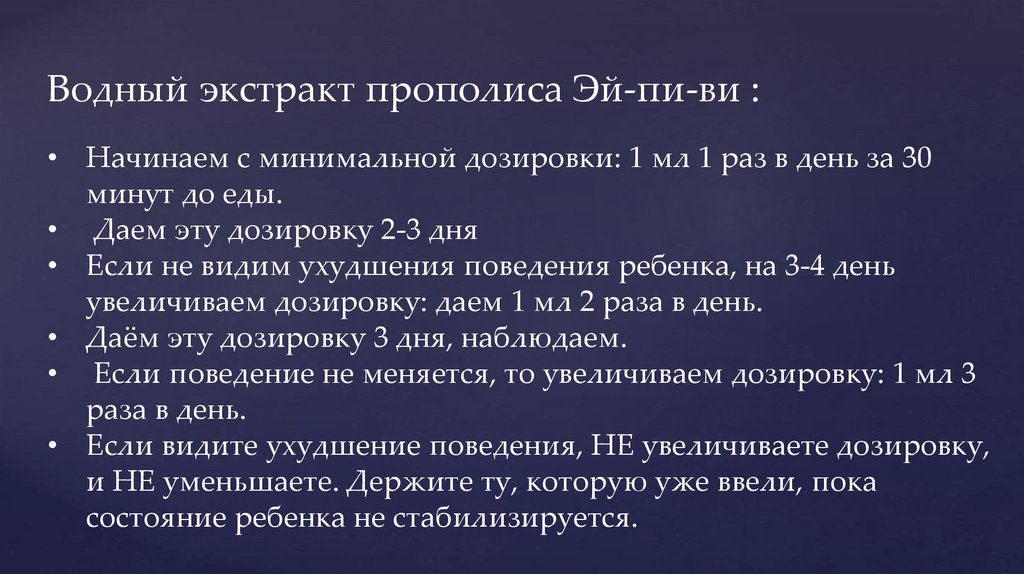 Водный экстракт прополиса Эй-пи-ви :• Начинаем с минимальной дозировки: 1 мл 1 раз в день за 30