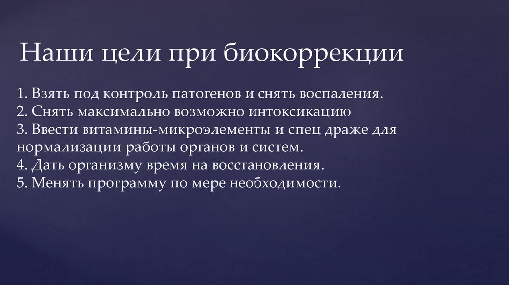 Наши цели при биокоррекции1. Взять под контроль патогенов и снять воспаления.
