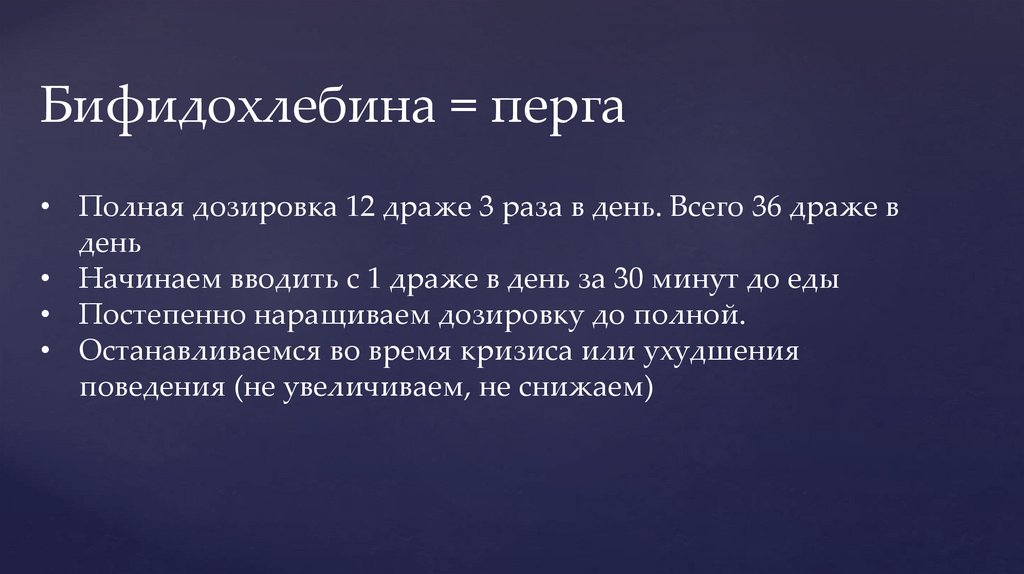 Бифидохлебина = перга• Полная дозировка 12 драже 3 раза в день. Всего 36 драже в