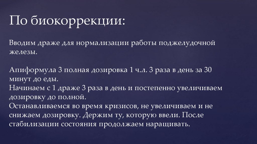 По биокоррекции:Вводим драже для нормализации работы поджелудочной