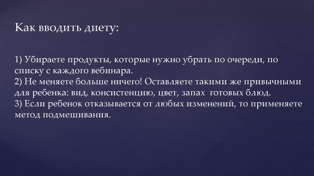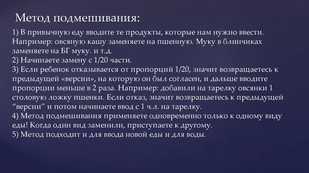 Метод подмешивания:1) В привычную еду вводите те продукты, которые нам нужно ввести.