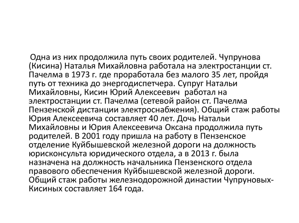 Одна из них продолжила путь своих родителей. Чупрунова(Кисина) Наталья Михайловна работала на электростанции ст.