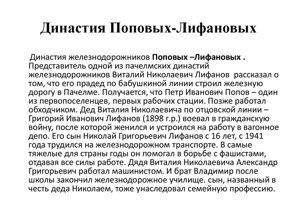 Династия Поповых-ЛифановыхДинастия железнодорожников Поповых –Лифановых .