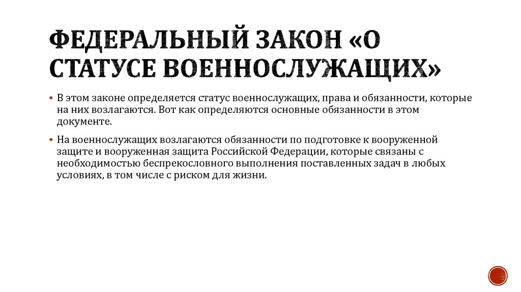 В этом законе определяется статус военнослужащих, права и обязанности, которыена них возлагаются. Вот как определяются основные обязанности в этом