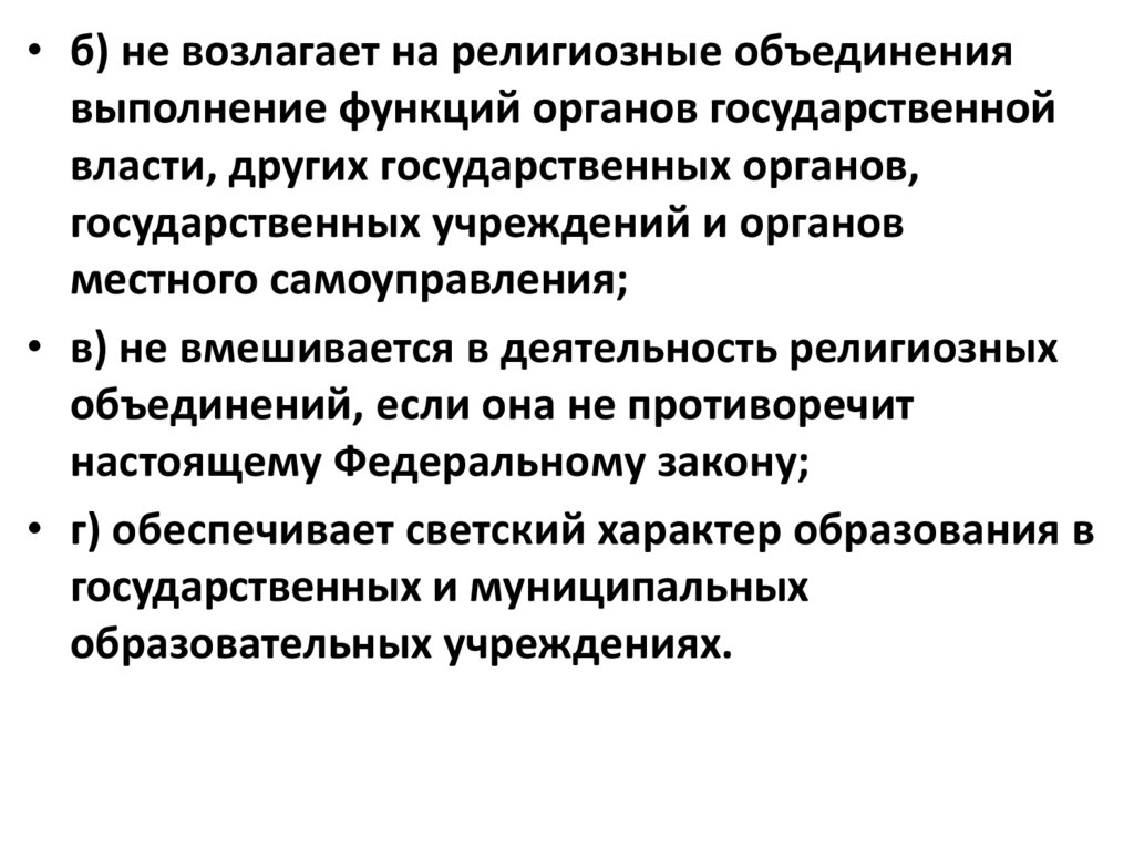 • б) не возлагает на религиозные объединениявыполнение функций органов государственной