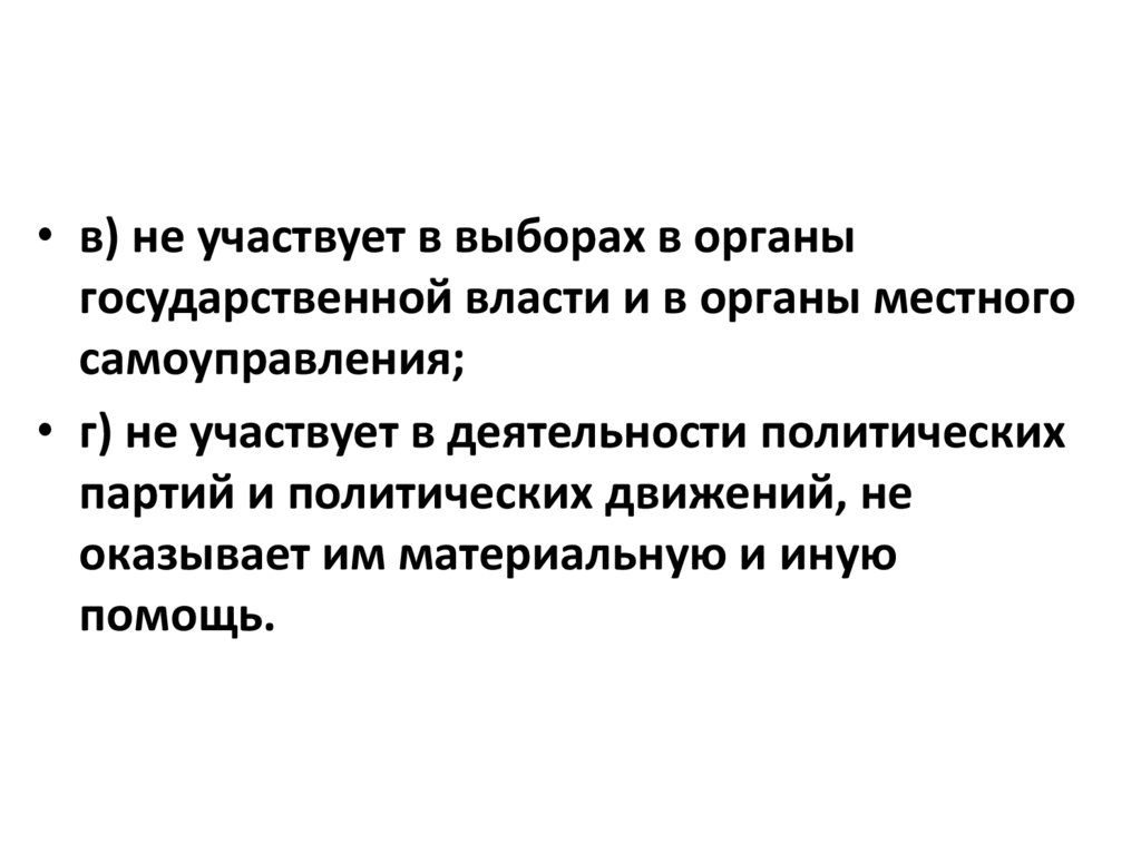 • в) не участвует в выборах в органыгосударственной власти и в органы местного