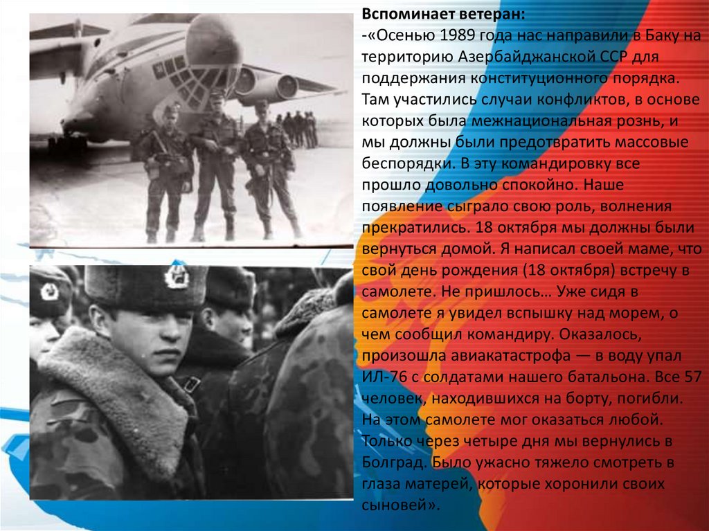Вспоминает ветеран:-«Осенью 1989 года нас направили в Баку на