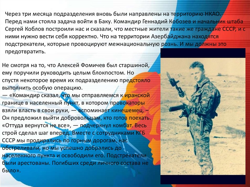Через три месяца подразделения вновь были направлены на территорию НКАО.Перед нами стояла задача войти в Баку. Командир Геннадий Кобозев и начальник штаба