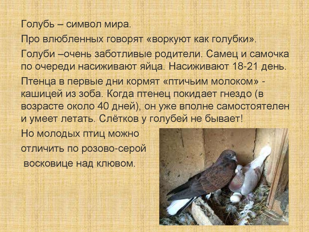 Голубь – символ мира.Про влюбленных говорят «воркуют как голубки».