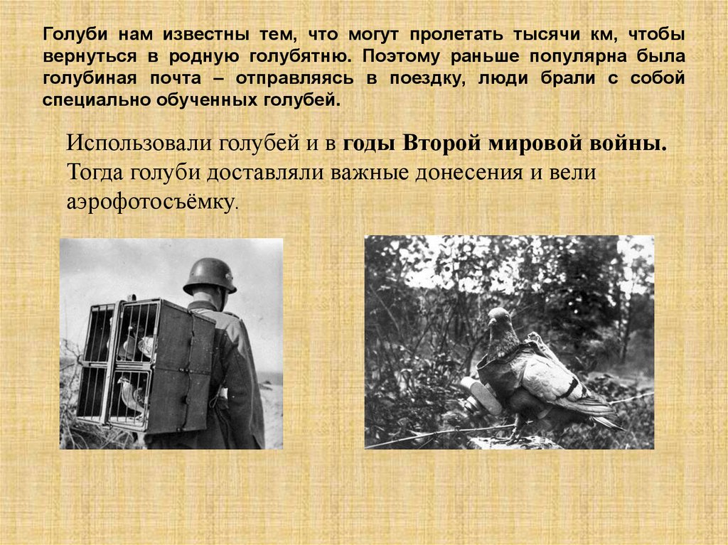 Голуби нам известны тем, что могут пролетать тысячи км, чтобывернуться в родную голубятню. Поэтому раньше популярна была