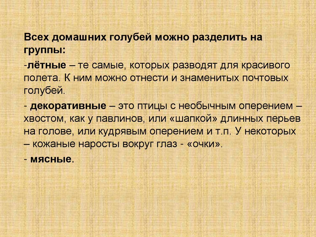Всех домашних голубей можно разделить нагруппы: