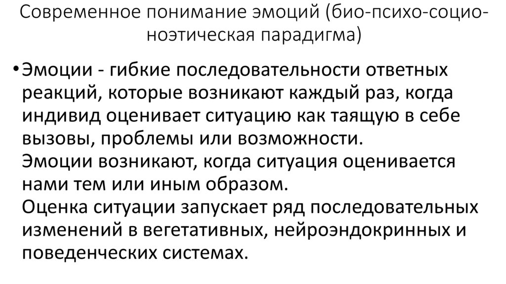 Современное понимание эмоций (био-психо-соционоэтическая парадигма)• Эмоции - гибкие последовательности ответных