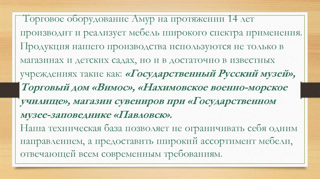 Торговое оборудование Амур на протяжении 14 летпроизводит и реализует мебель широкого спектра применения.