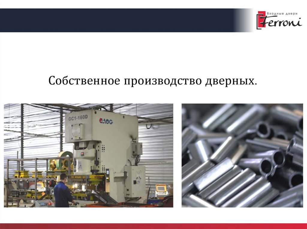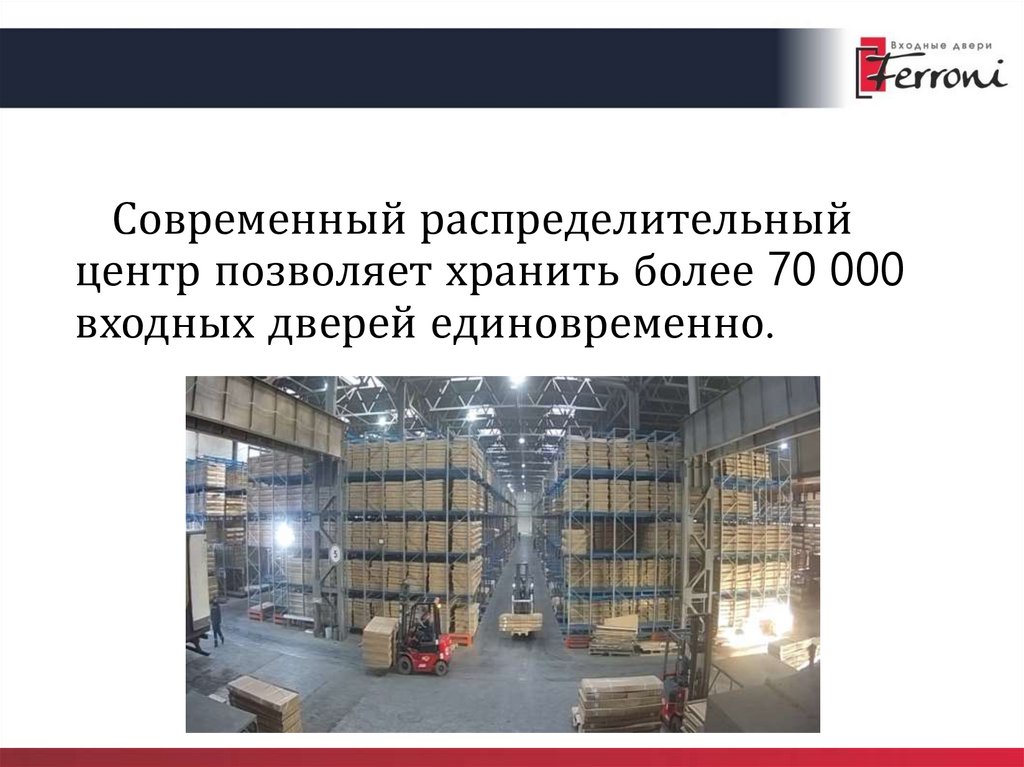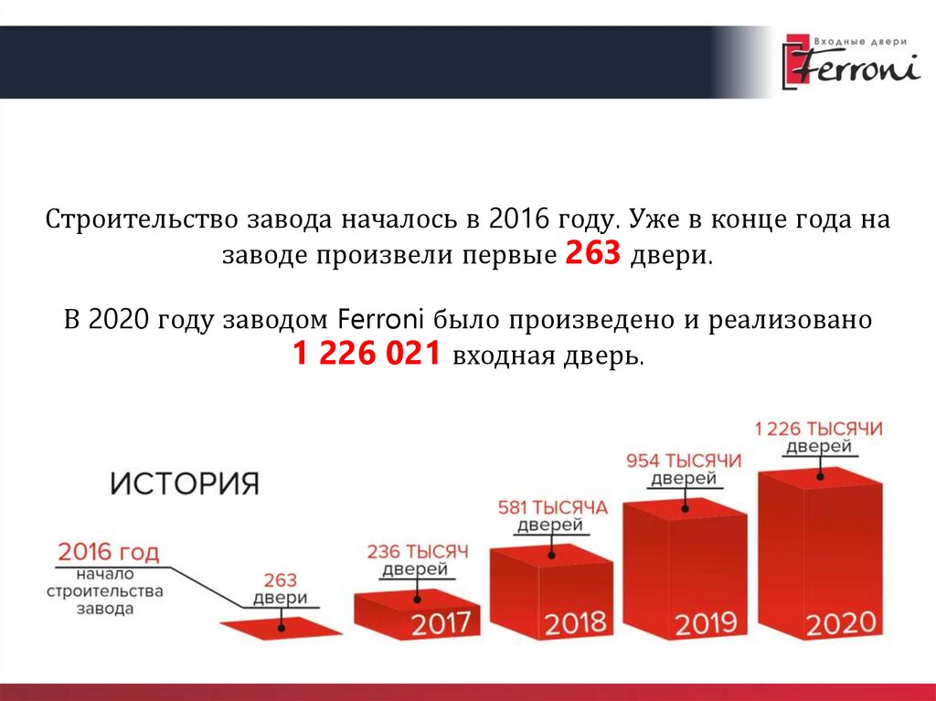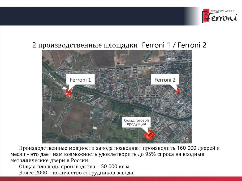 2 производственные площадки Ferroni 1 / Ferroni 2Производственные мощности завода позволяют производить 160 000 дверей в