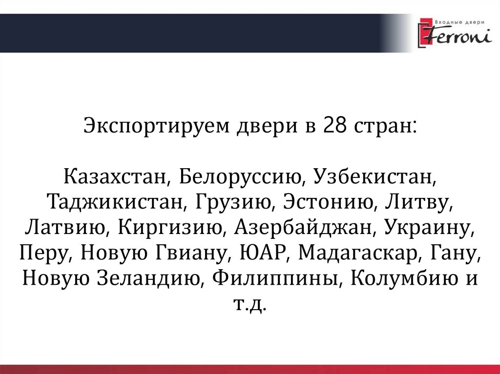 Экспортируем двери в 28 стран:Казахстан, Белоруссию, Узбекистан,