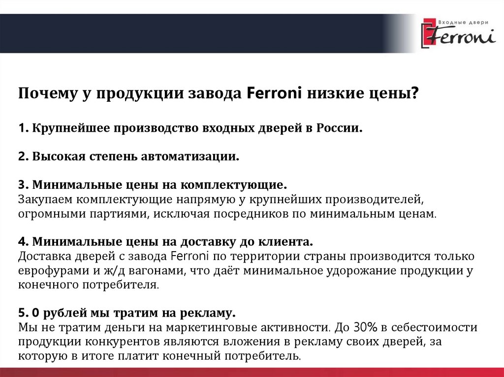 Почему у продукции завода Ferroni низкие цены?1. Крупнейшее производство входных дверей в России.