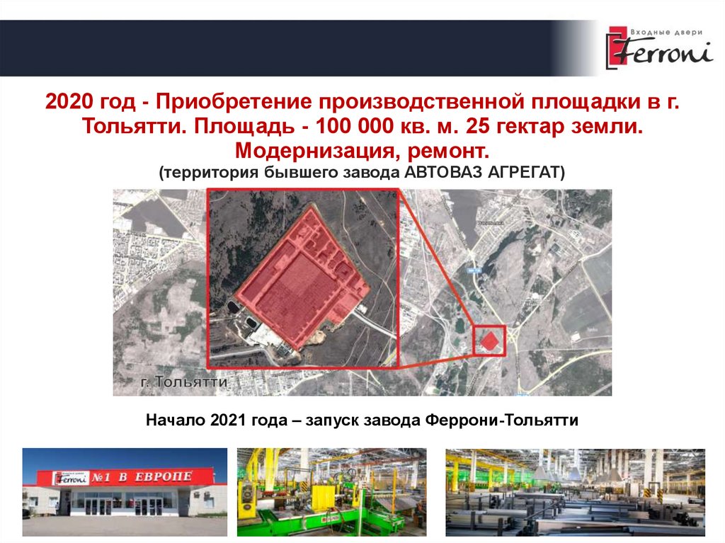2020 год - Приобретение производственной площадки в г.Тольятти. Площадь - 100 000 кв. м. 25 гектар земли.
