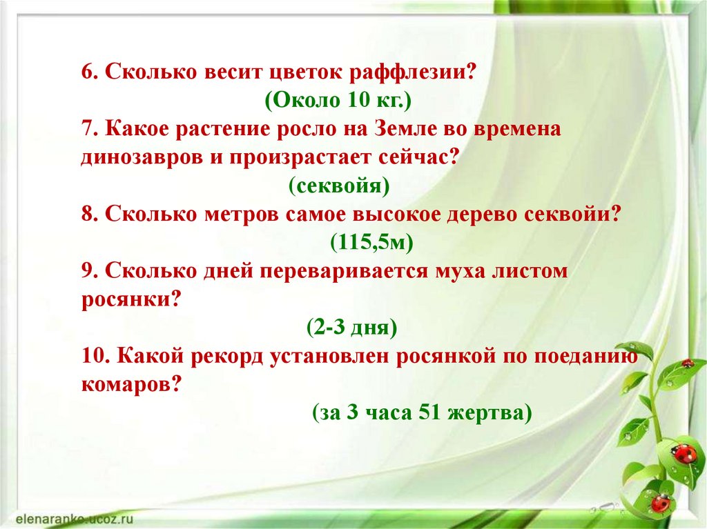 6. Сколько весит цветок раффлезии?(Около 10 кг.)