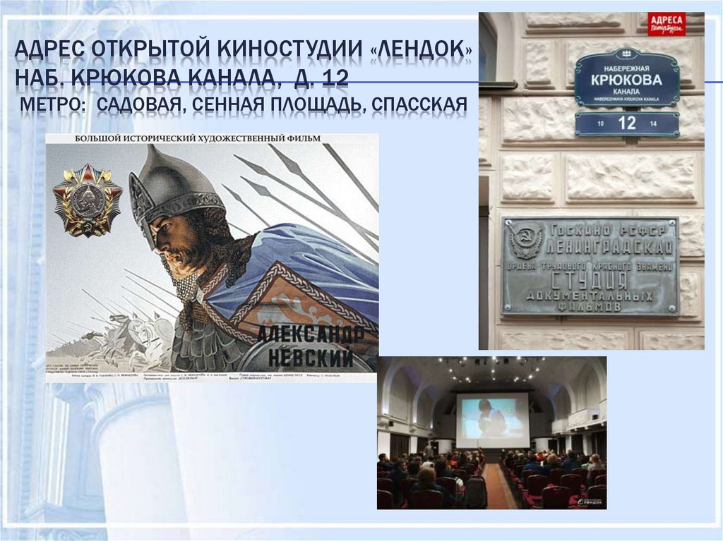 АДРЕС ОТКРЫТОЙ КИНОСТУДИИ «ЛЕНДОК»НАБ. КРЮКОВА КАНАЛА, Д. 12