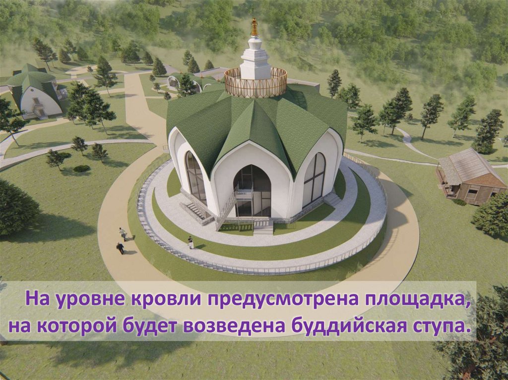 На уровне кровли предусмотрена площадка,на которой будет возведена буддийская ступа.