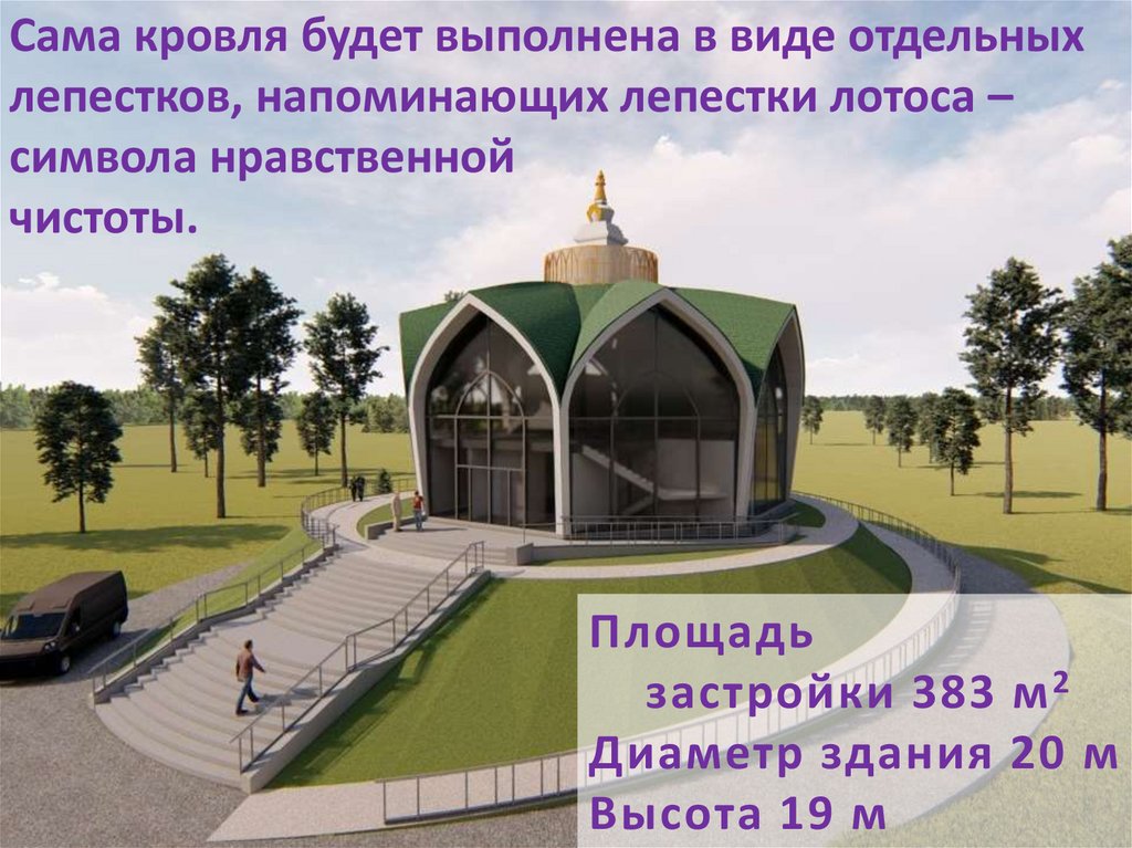 Сама кровля будет выполнена в виде отдельныхлепестков, напоминающих лепестки лотоса –