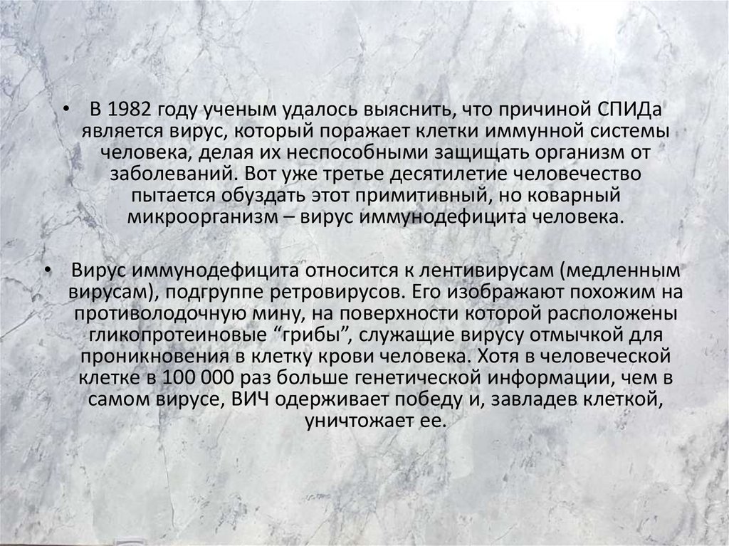 • В 1982 году ученым удалось выяснить, что причиной СПИДаявляется вирус, который поражает клетки иммунной системы