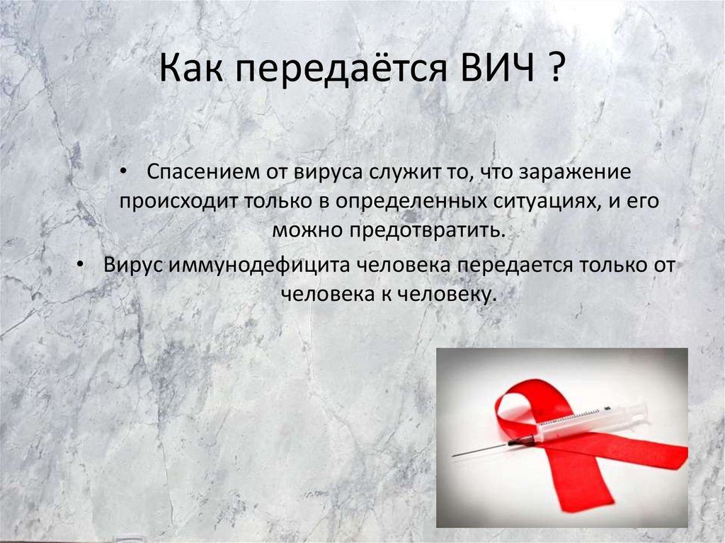 Как передаётся ВИЧ ?• Спасением от вируса служит то, что заражение