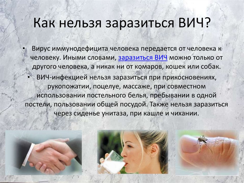 • ВИЧ-инфекцией нельзя заразиться при прикосновениях,