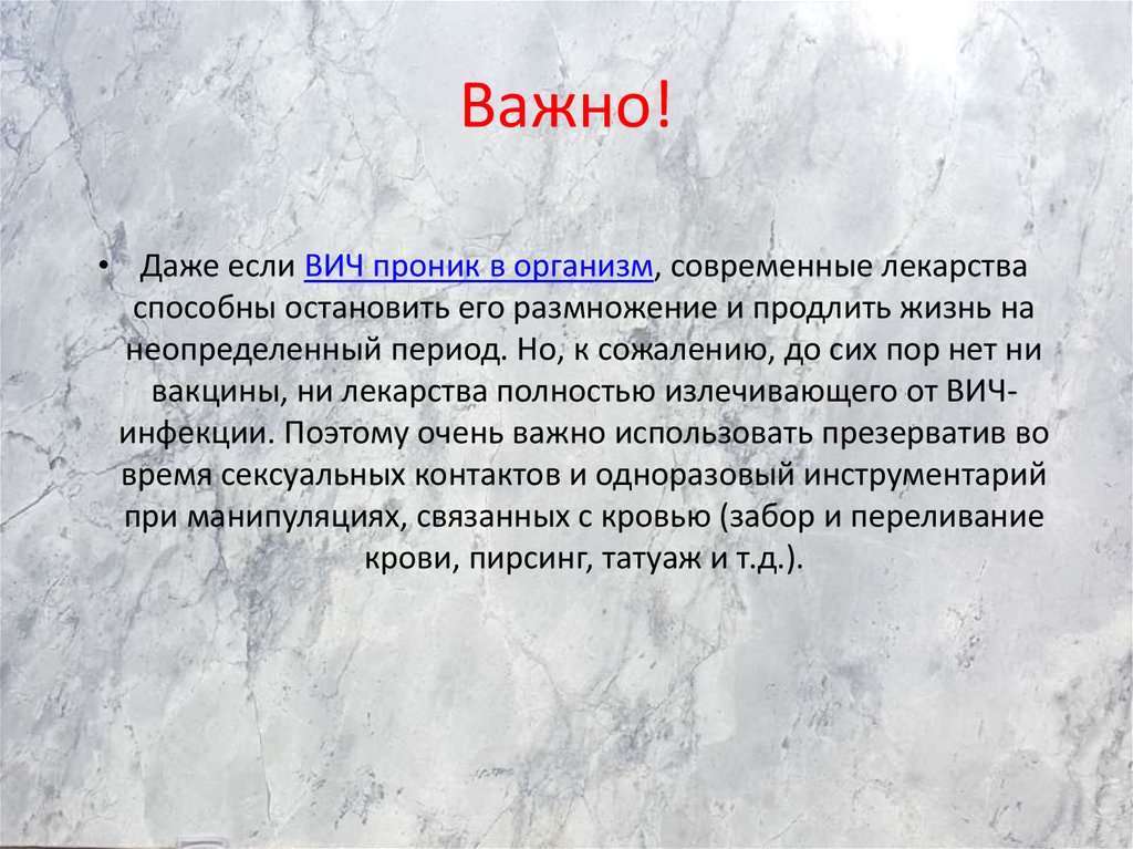 Важно!• Даже если ВИЧ проник в организм, современные лекарства