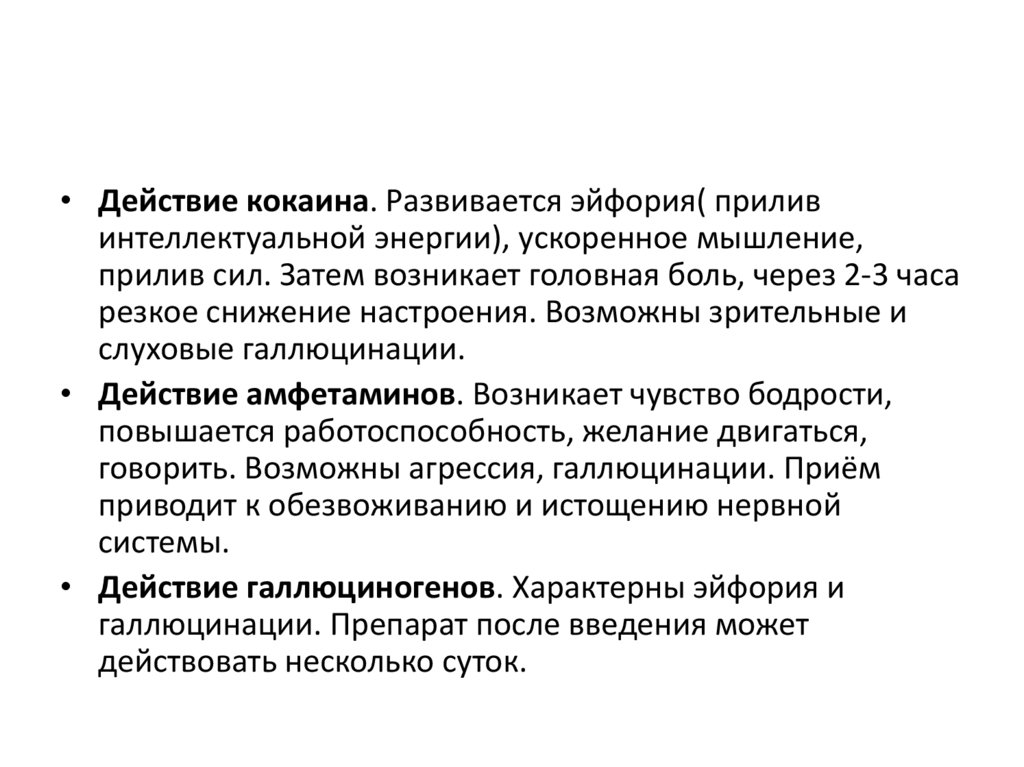• Действие кокаина. Развивается эйфория( приливинтеллектуальной энергии), ускоренное мышление,