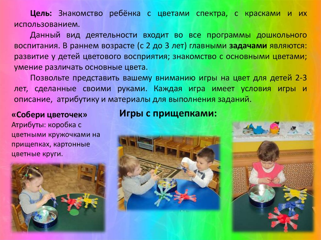 развитие у детей цветового восприятия; знакомство с основными цветами;